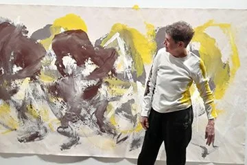 Think of it as calligraphy or writing, which in Chinese tradition is an active, physical and repetitive practice. Cosmic energy, or qi, comes down through the body and out through the hand and the brush. I simply eliminate the hand and the brush. I make these paintings by dipping my torso into liquid paint and then rubbing it down the side of the canvas. Between each stroke, I crouch down into the paint, where I can center myself before reaching up and leaving another trace.